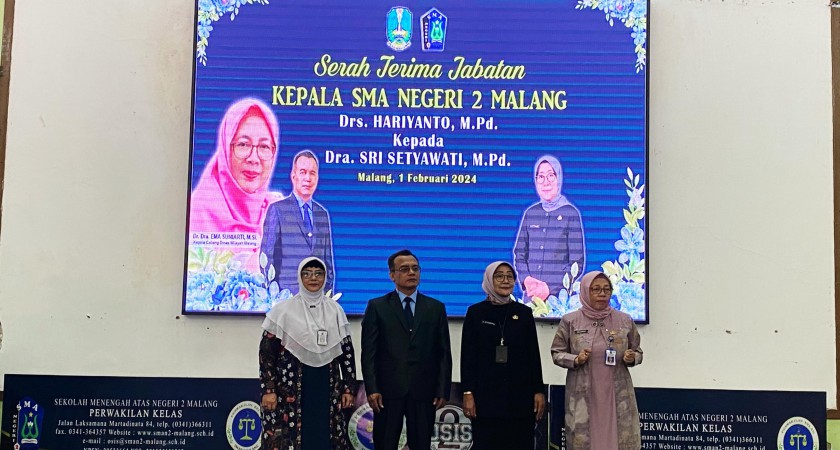 Malang - (1/2/2024) - Pada hari Kamis ini, tepatnya tanggal 01 Februari 2024, dilaksanakan acara serah terima jabatan Kepala SMA Negeri 2 Malang. Drs. Hariyanto, M.Pd., yang sebelumnya menjabat, akan melepas tanggung jawabnya kepada Dra. Sri Setyawati, M.Pd.